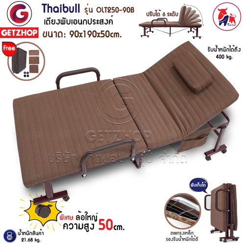 Thaibull เตียงนอนแบบพับ เตียงพร้อมเบาะรองนอน เตียงผู้ป่วย เตียงเหล็ก สูง 50 cm. ล้อใหญ่พิเศษ! รุ่น OLT250-90B (Brown)