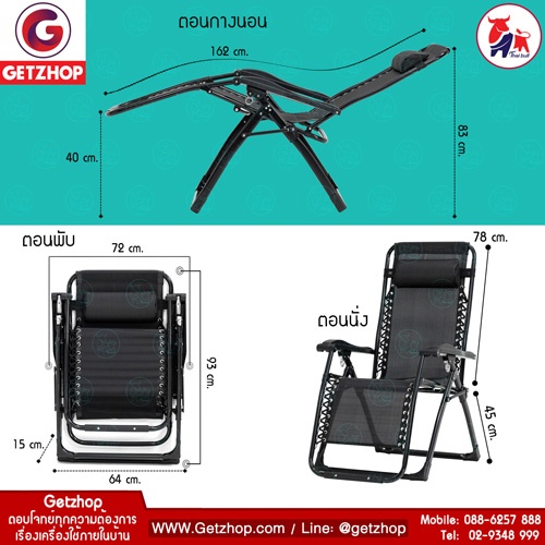 ขนาดเก้าอี้ (นอน) 170 องศา : กว้าง xยาว xสูง : 72x162x83cm.(ความสูงถึงที่เท้าแขน)