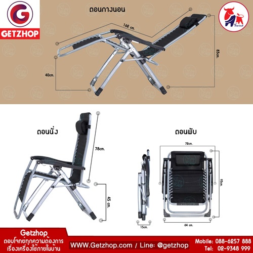 ขนาดเก้าอี้ (นอน) 170 องศา : กว้าง xยาว xสูง : 72x162x83cm.(ความสูงถึงที่เท้าแขน)