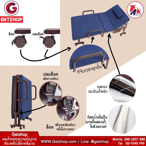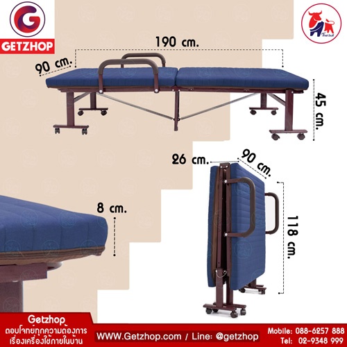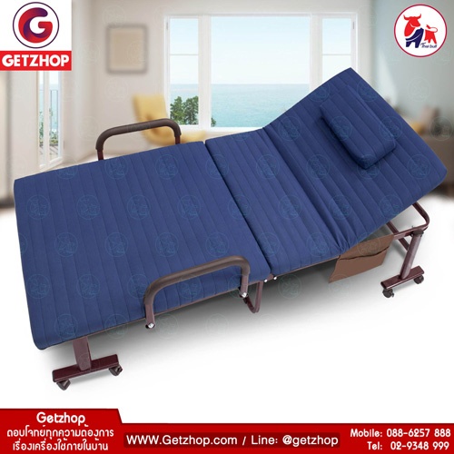 Getzhop เตียงนอนแบบพับ เตียงพร้อมเบาะรองนอน เตียงผู้ป่วย เตียงเหล็ก Straight ล้อใหญ่พิเศษ! รุ่น OLT245-90B ขนาด 3 ฟุต 90x190x45cm. (สีน้ำเงิน)