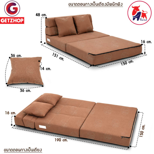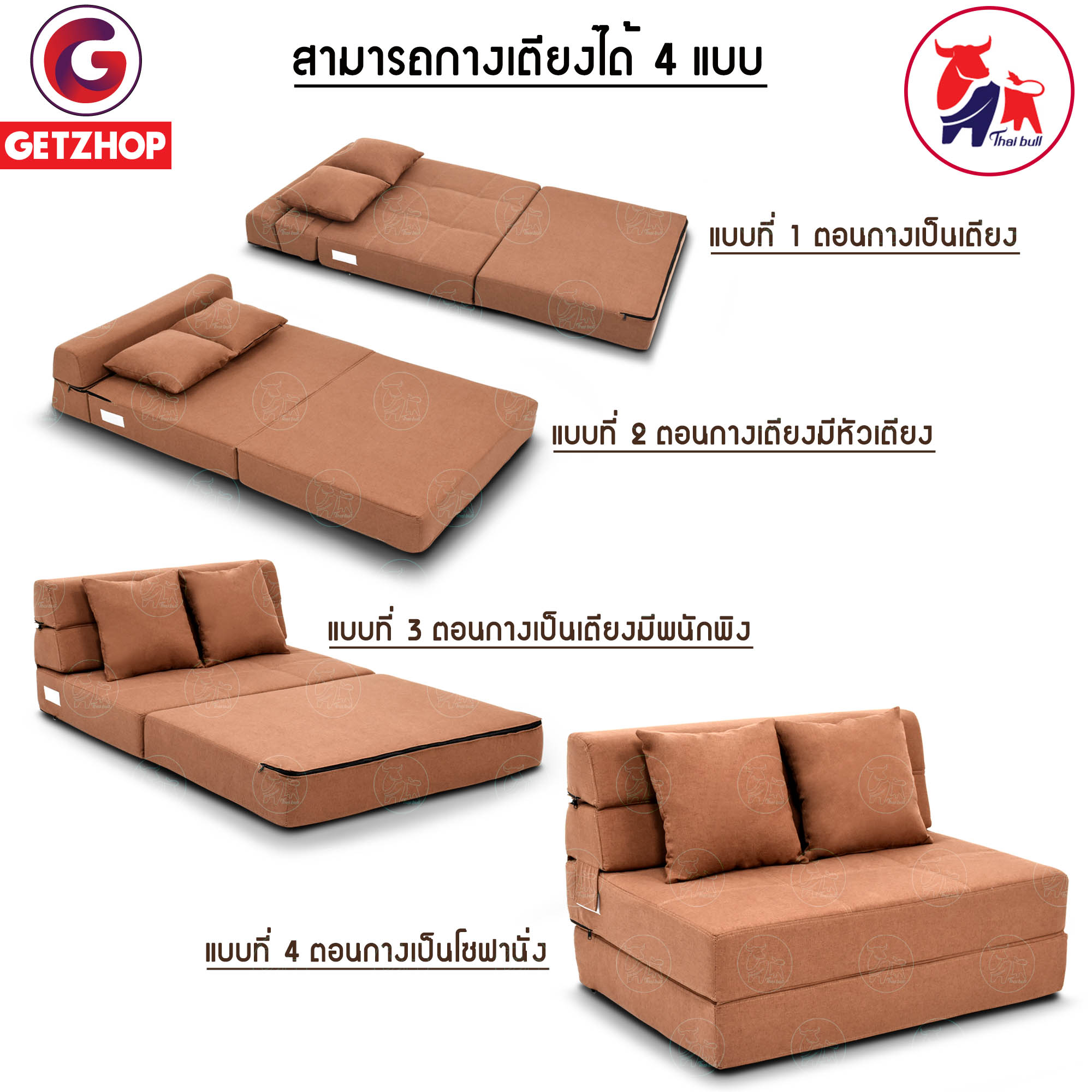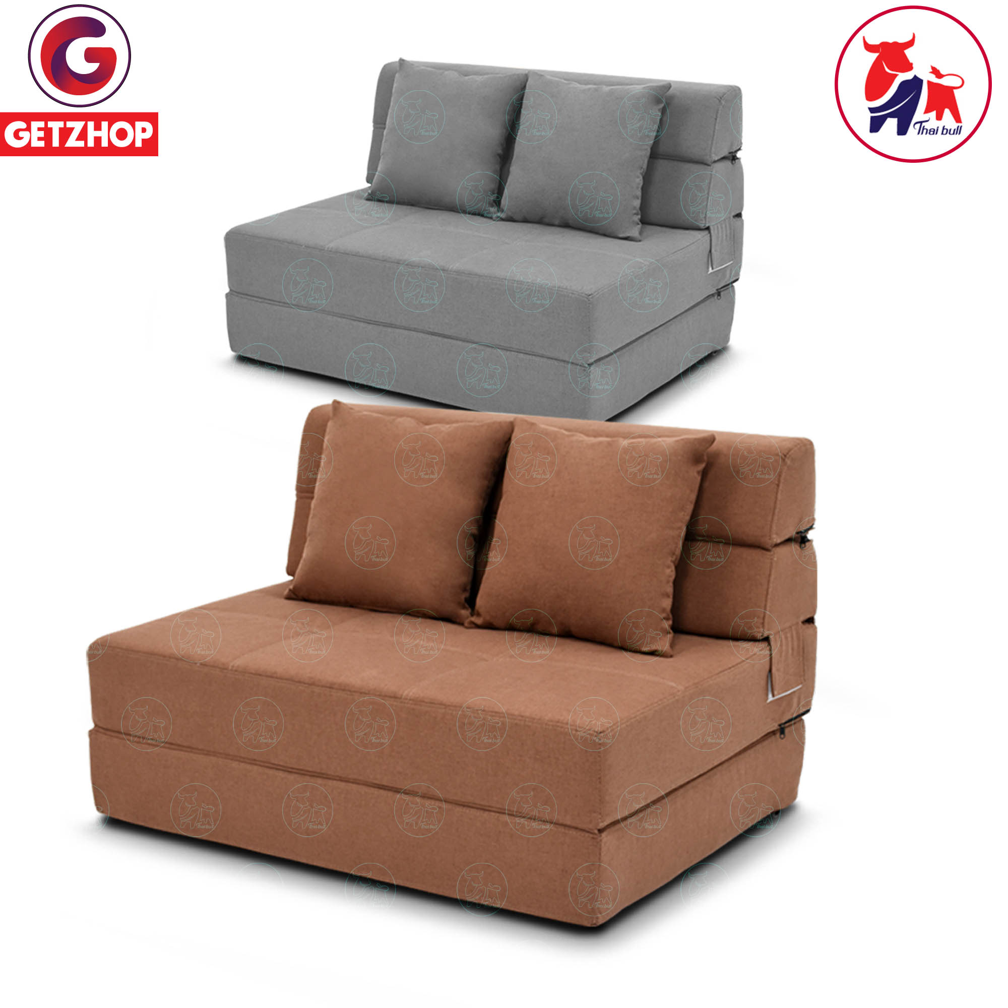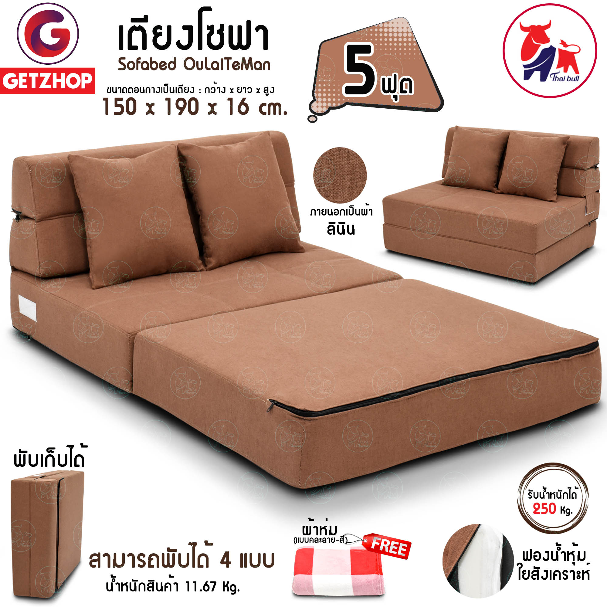 Getzhop เตียงโซฟา โซฟาเบด โซฟาปรับนอน 2 ที่นั่ง Sofabed Thaibull รุ่น OLT501-150 ขนาด 150*190*16 cm. (5ฟุต) แถมฟรี! หมอน 2 ใบ + ผ้า (คละแบบ) สีน้ำตาล