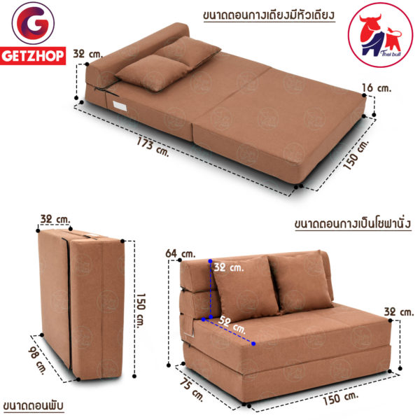 2. ขนาดตอนกางเป็นโซฟานั่ง : กว้าง x ยาว x สูง : (75*150*32 cm.)ความสูงจากพื้นถึงพนักพิง 64 cm./ความสูงจากเบาะนั่งถึงพนักพิง 32 cm./ความลึก 52 cm.