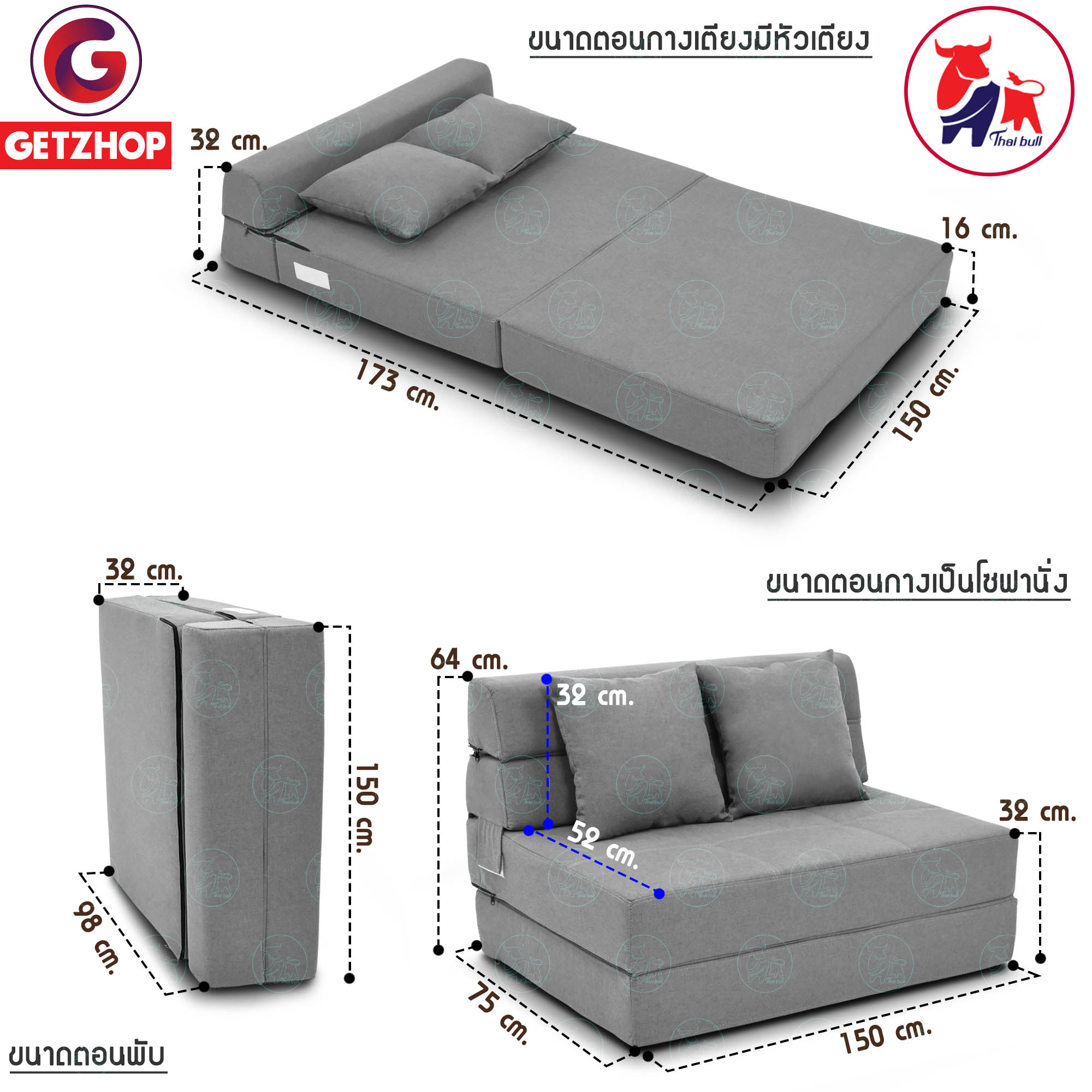 2. ขนาดตอนกางเป็นโซฟานั่ง : กว้าง x ยาว x สูง : (75*150*32 cm.)ความสูงจากพื้นถึงพนักพิง 64 cm./ความสูงจากเบาะนั่งถึงพนักพิง 32 cm./ความลึก 52 cm.