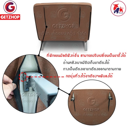 - เมื่อปรับนั่งเป็นโซฟาแล้ว ด้านหลัง ออกแบบดีไซน์ทันสมัย ให้ขาพับเก็บได้ (ขณะที่พับเก็บต้องกดปุ่มตรงขาเตียงเพื่อคลายล็อค จึงพับเก็บ)
