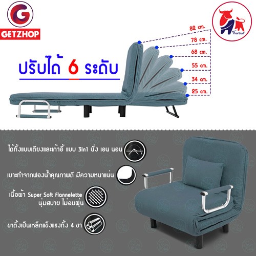 • โซฟาเบด สามารถปรับเอนนอนได้ 6 ระดับ (ความสูงจากจากพื้น-พนักพิง แต่ละระดับ 25 cm.,34cm.,55cm.,68cm.,78cm.,82cm.)