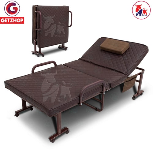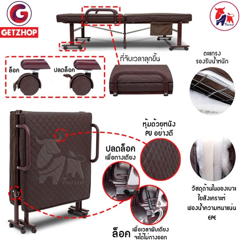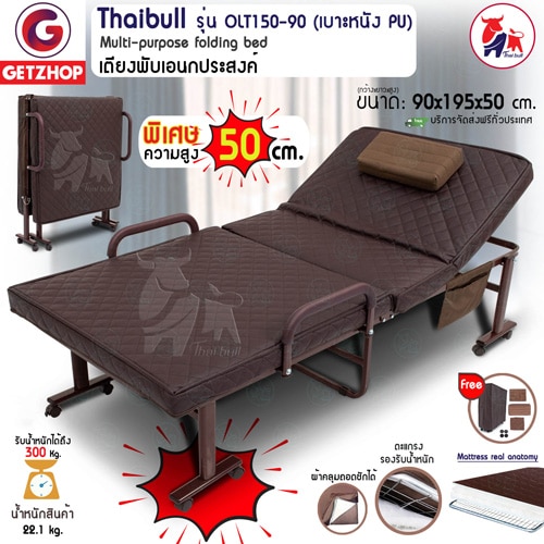 Getzhop เตียงนอนพับได้ เตียงพร้อมเบาะรองนอน เตียงผู้ป่วย รุ่นสูงพิเศษ 50 cm.Thaibull รุ่น OLT150-90 ขนาด 90x195x50 cm. (หนัง PU) แถมฟรี! หมอน ถุงคลุมกันฝุ่น ผ้าคลุม (คละแบบ)