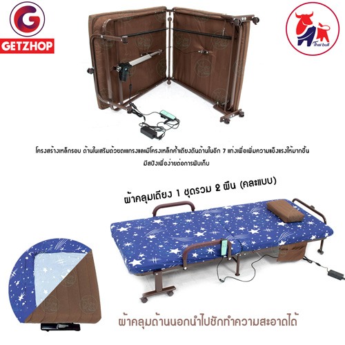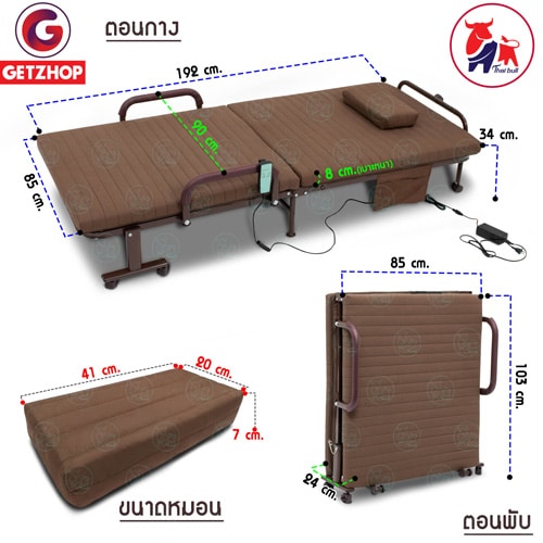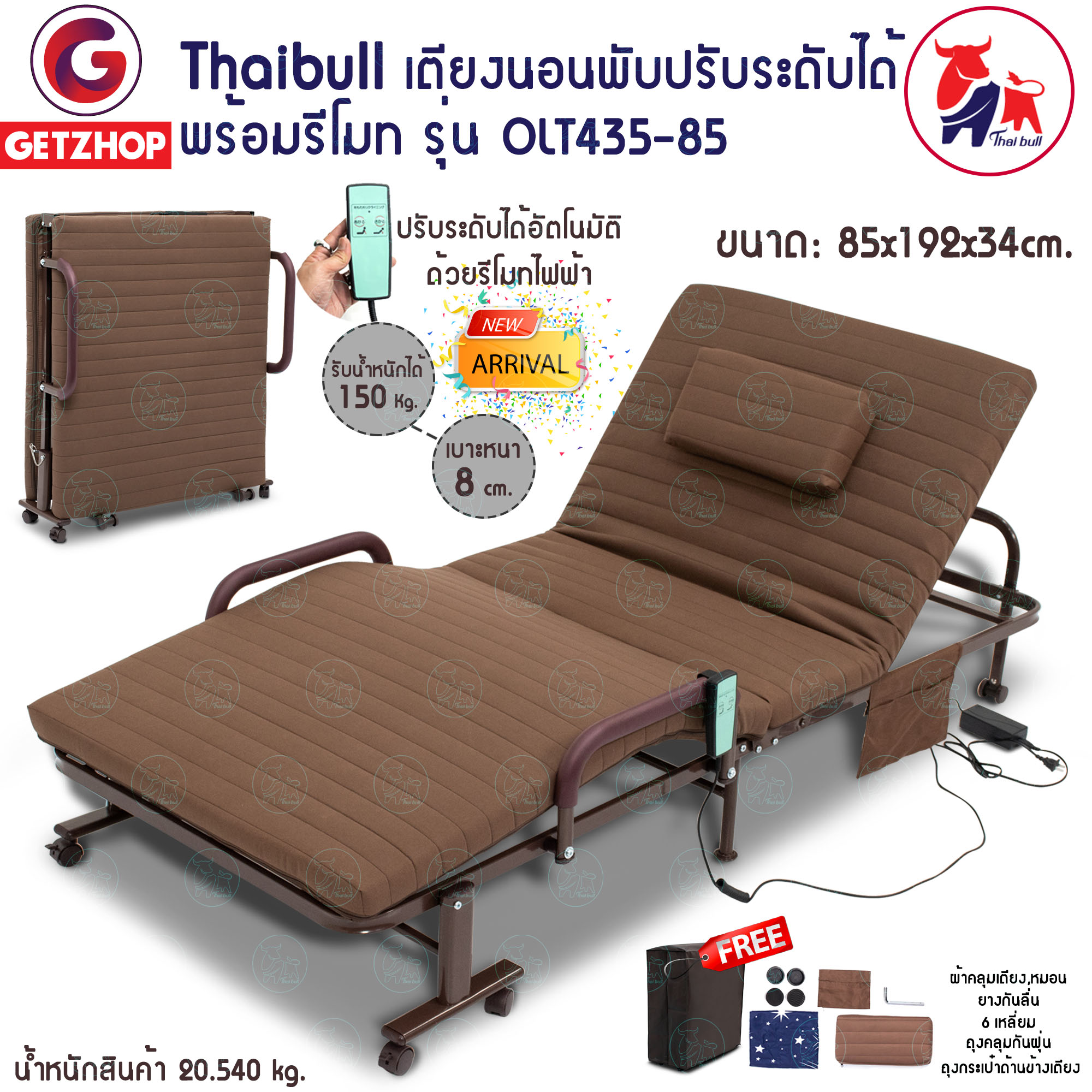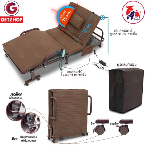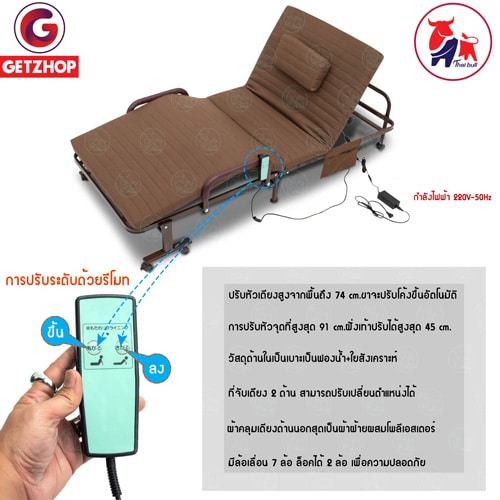 Getzhop เตียงนอนปรับระดับได้ พร้อมรีโมท เตียงนอนพับได้ เตียงพร้อมเบาะรองนอน Thaibull รุ่น OLT435-85 ขนาด 85 x192x34 cm.(Brown)
