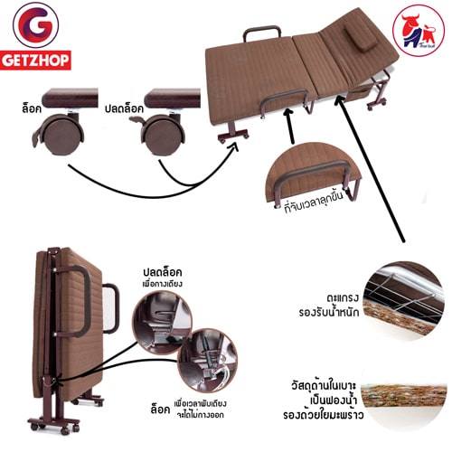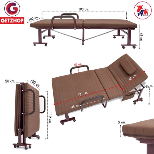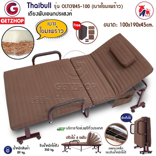 Getzhop เตียงพับได้ เตียงอเนกประสงค์ เตียงพร้อมเบาะรองนอน เตียงผู้ป่วย เตียงเหล็ก Thaibull รุ่น OLTCF245-100 พิเศษ! เบาะใยมะพร้าว ขนาด 100x190x45cm. (Brown)