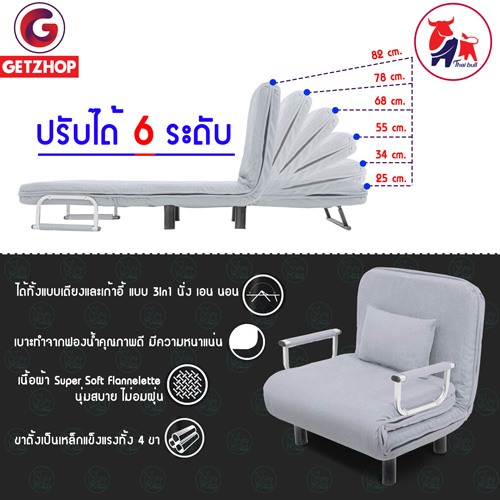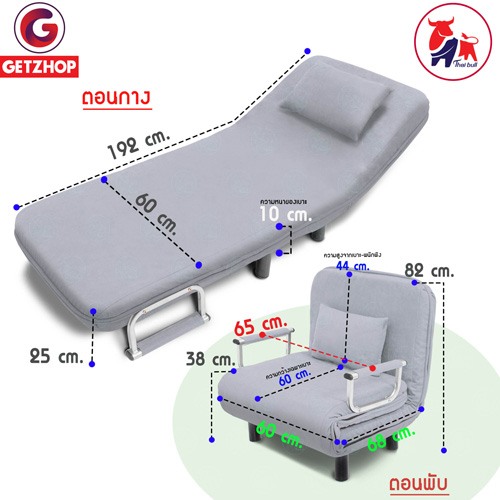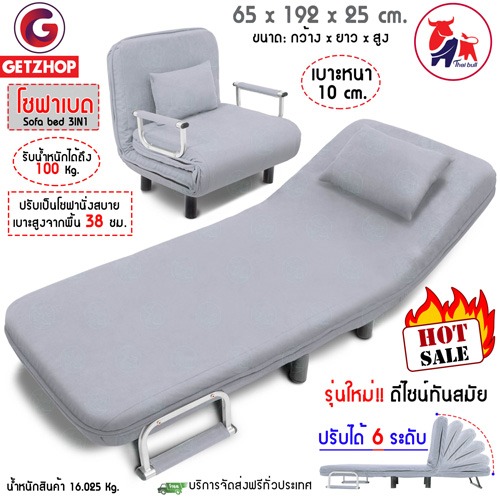 Getzhop โซฟาเบด เตียงนอน โซฟานั่งและเตียงนอน Thaibull Sofa Bed (3IN1) RL832-65 ขนาด (65x 192 x25 cm.) สีเทาอ่อน