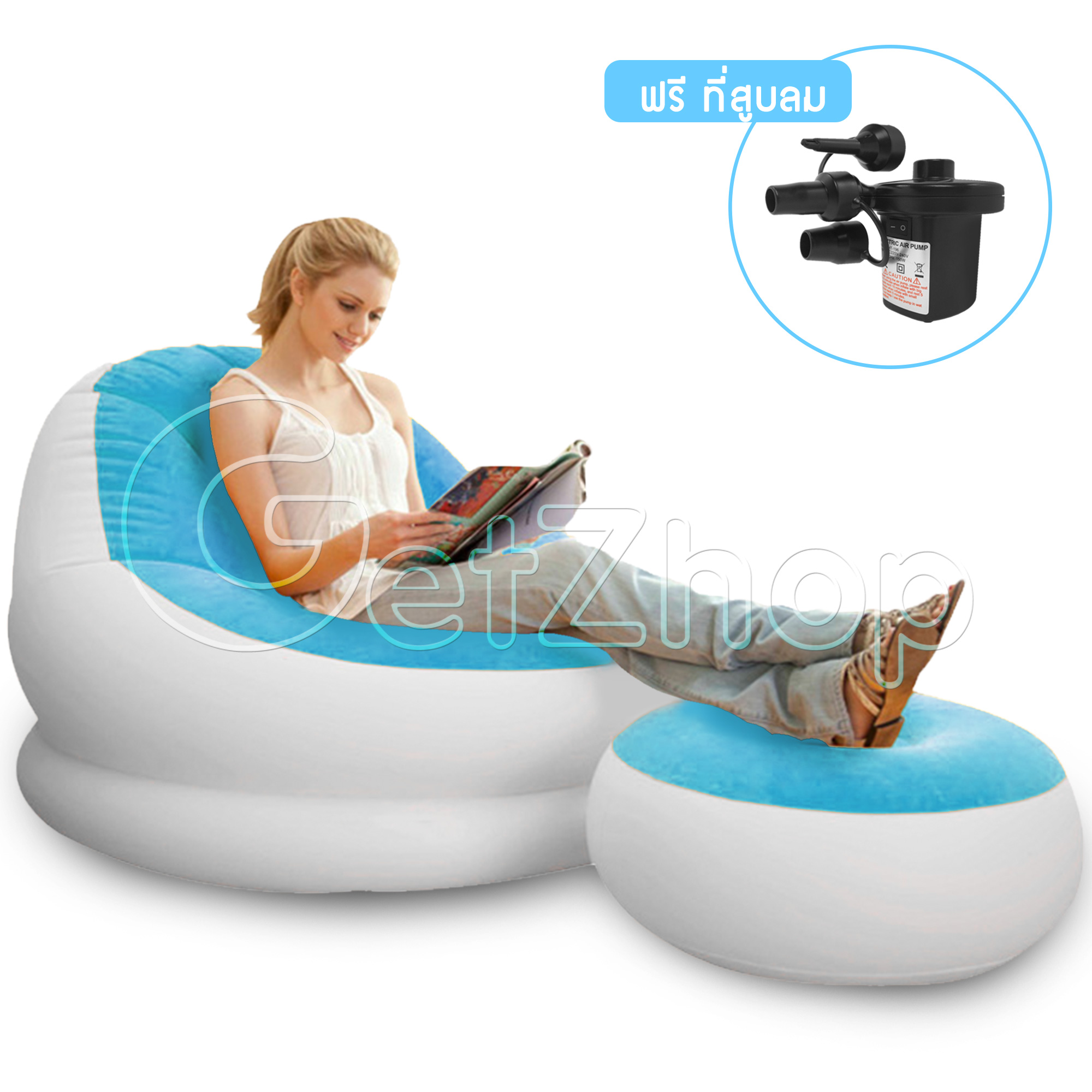 Getzhop โซฟาเป่าลมเบาะวางขา โซฟา เบาะนั่ง (สีขาว/ฟ้า) แถมฟรี! ที่สูบลม