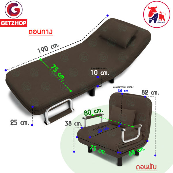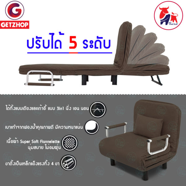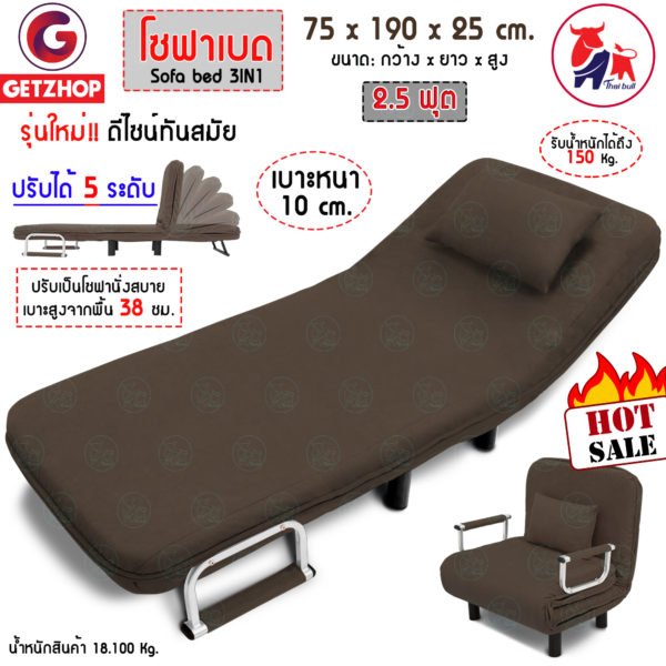 Thaibull รุ่น RL832-80 โซฟาเบด เตียงนอน โซฟานั่งและเตียงนอน Sofa bed 3IN1 ขนาด 190x75x25 cm. แถมฟรี! หมอนหนุนรองคอ (สีน้ำตาล)