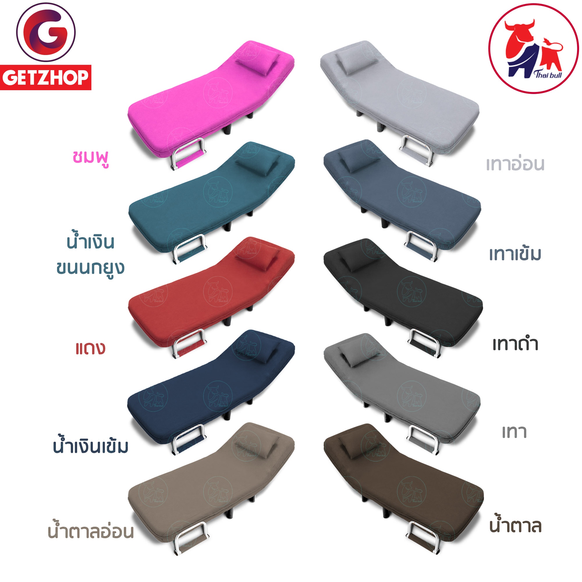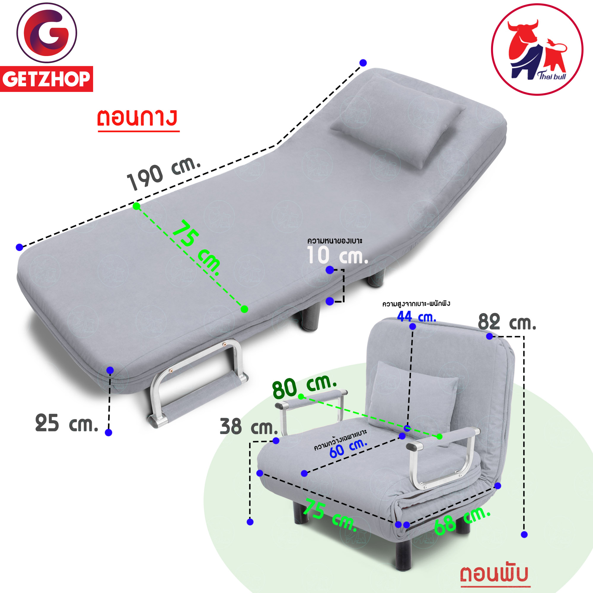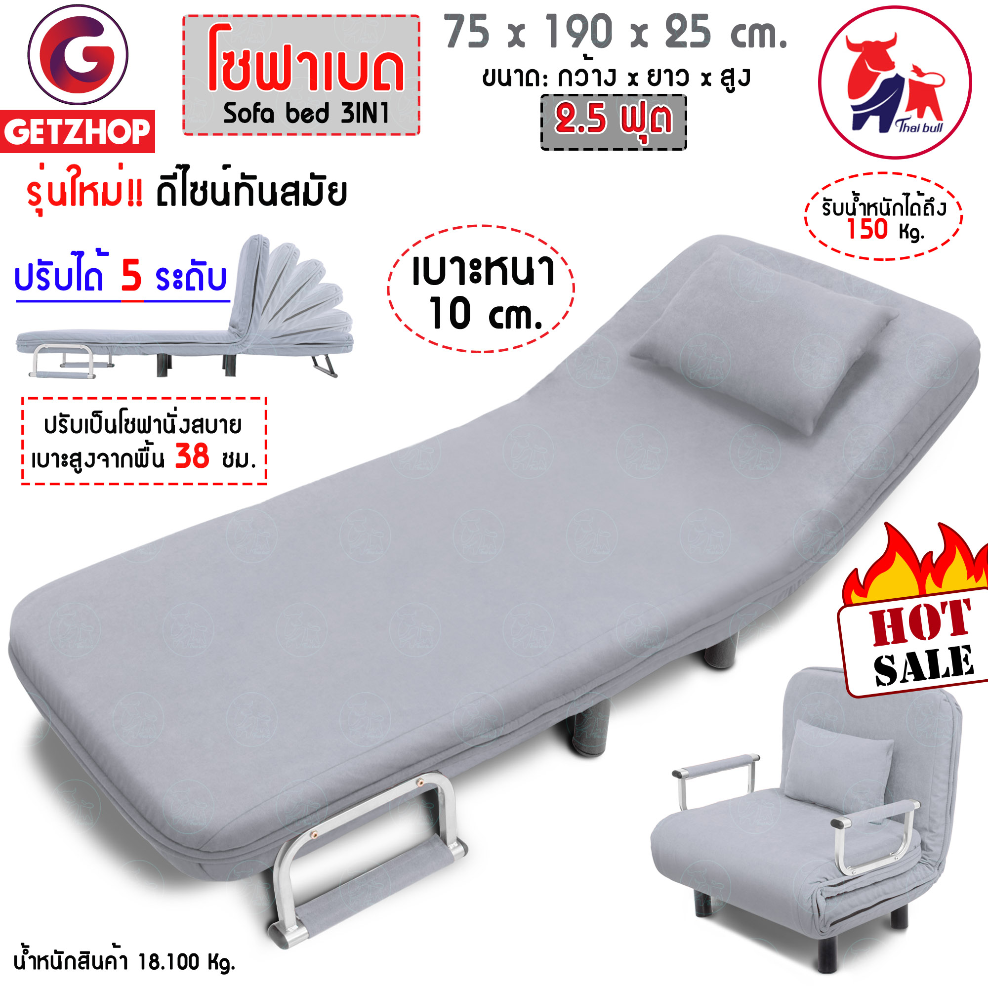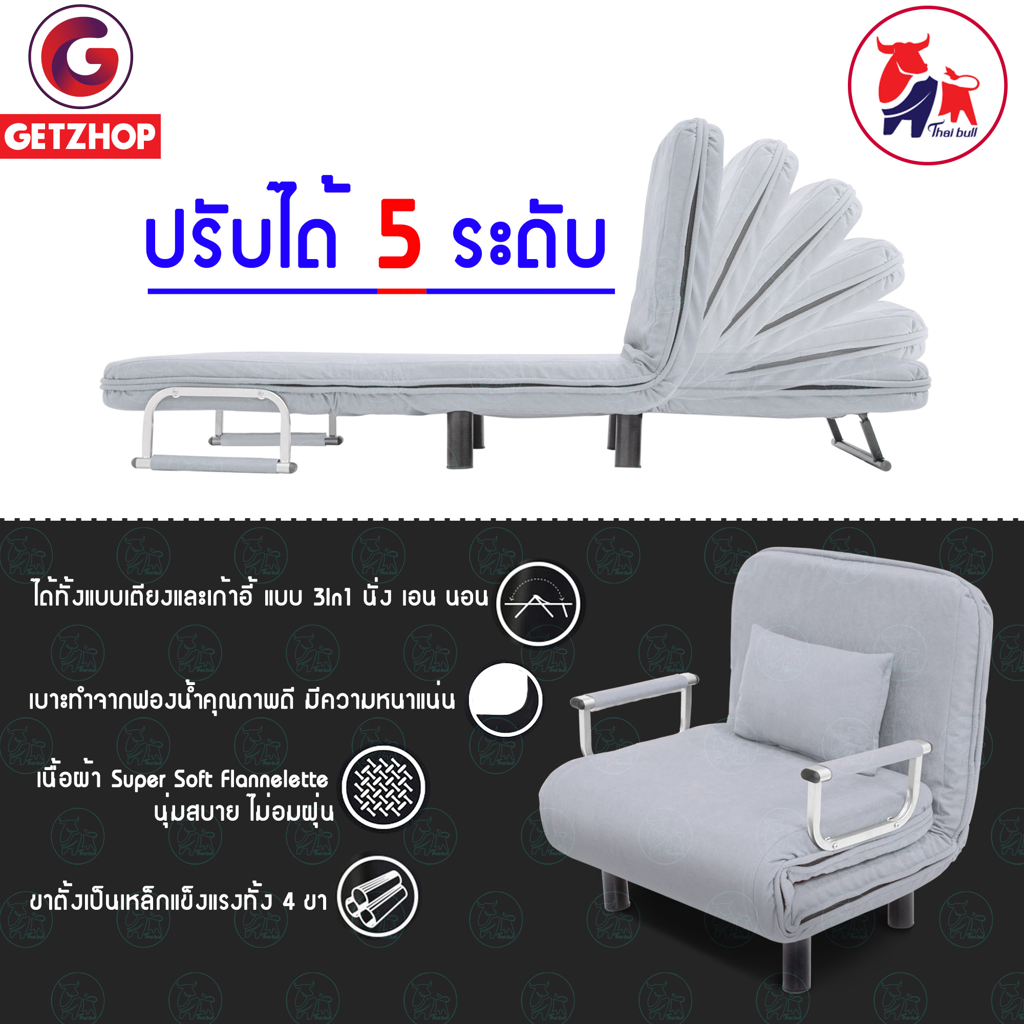 Getzhop โซฟาเบด เตียงนอน โซฟานั่งและเตียงนอน Sofa bed 3IN1 Thaibull รุ่น RL832-80 ขนาด 190x75x25 cm. แถมฟรี! หมอนอิง 1 ใบ (สีเทาอ่อน)
