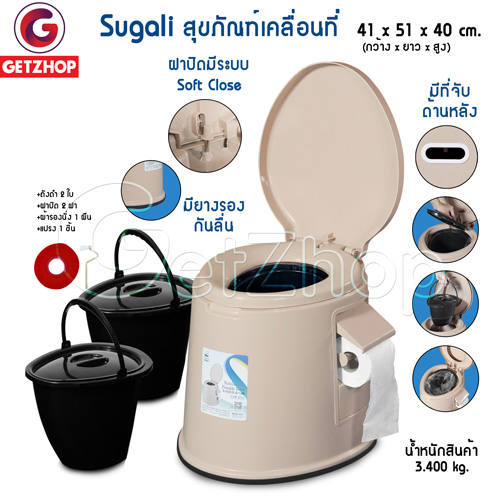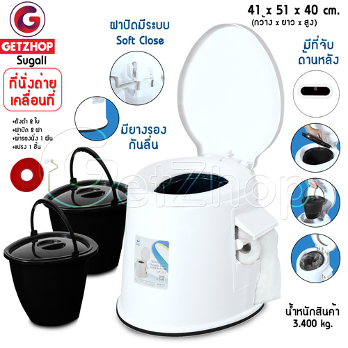 Sugali Portable toilet ส้วม ส้วมคนแก่นเคลื่อนที่ สุขภัณฑ์เคลื่อนที่ ที่นั่งถ่ายเคลื่อนที่ พร้อมถังดำ 2ถัง+ฝาปิด+ผ้ารองนั่ง+แปรง
