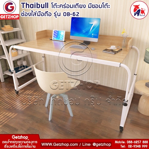 Thaibull รุ่น OB-62 โต๊ะทำงาน โต๊ะคร่อมเตียง โต๊ะอเนกประสงค์ มีขอบโต๊ะและช่องใส่มือถือ มีล้อ ขนาด 155 -240 สีขาว