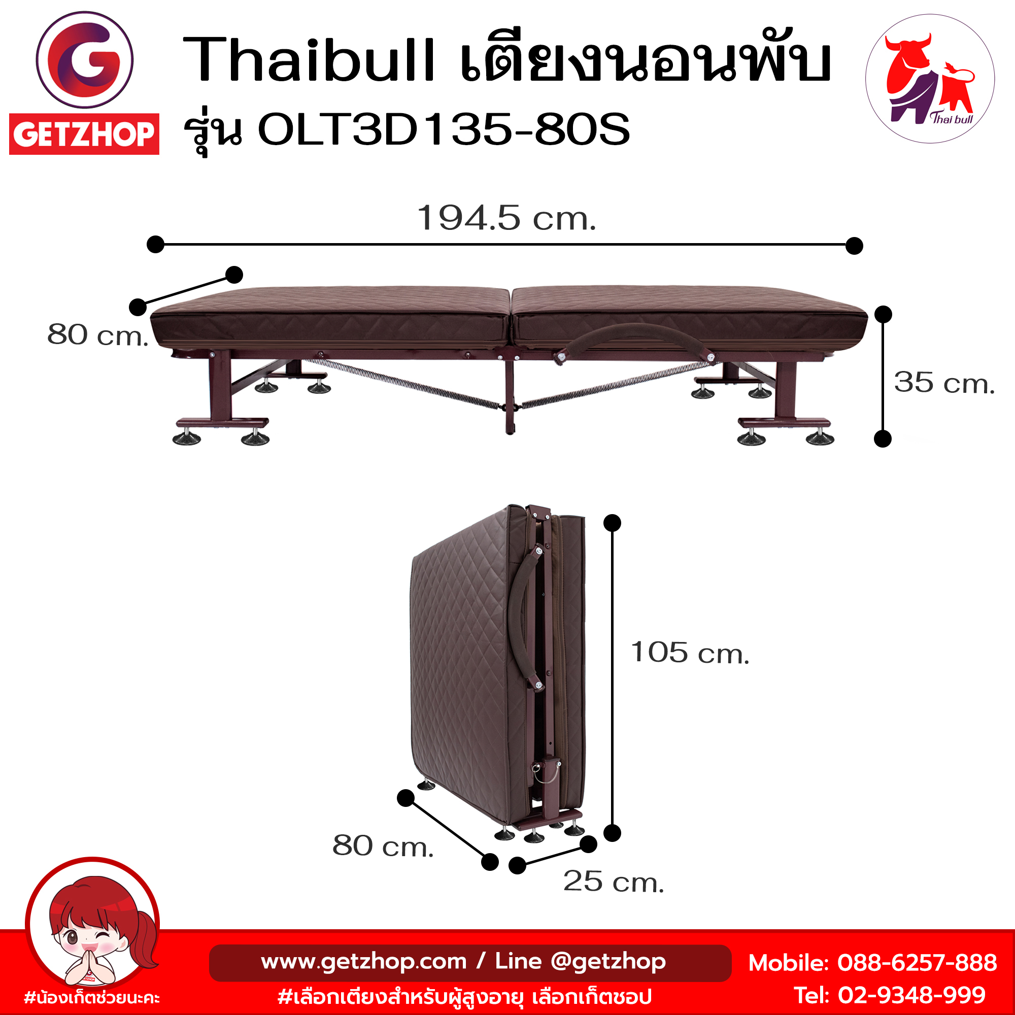 1. ขนาดเตียงตอนกาง : 80×194.5×35 cm./ น้ำหนักสินค้า 23.45 kg.