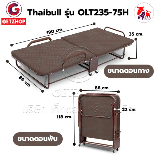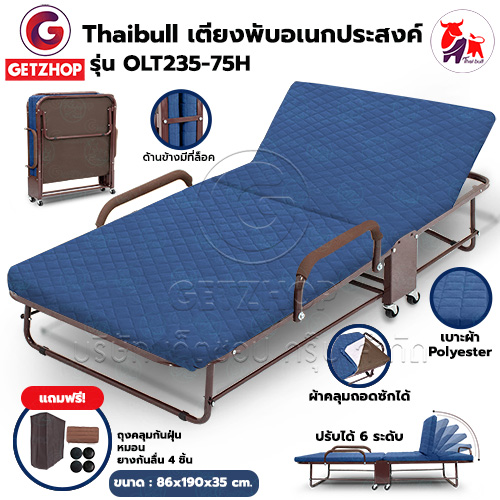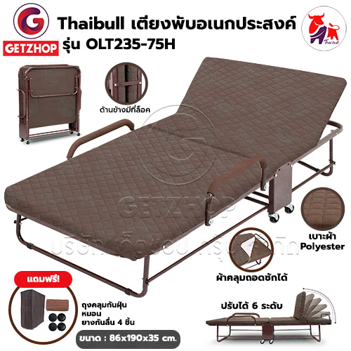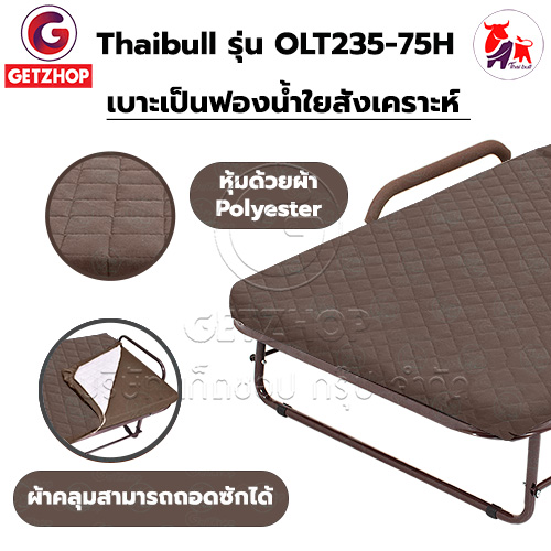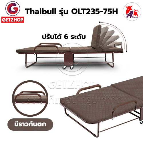 Thaibull เตียงนอนพับได้ เตียงเสริม เตียงพร้อมเบาะรองนอน เตียงปรับระดับได้ รุ่น OLT235-75H มีแขน (โครงน้ำตาล)