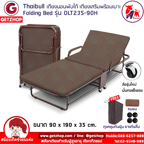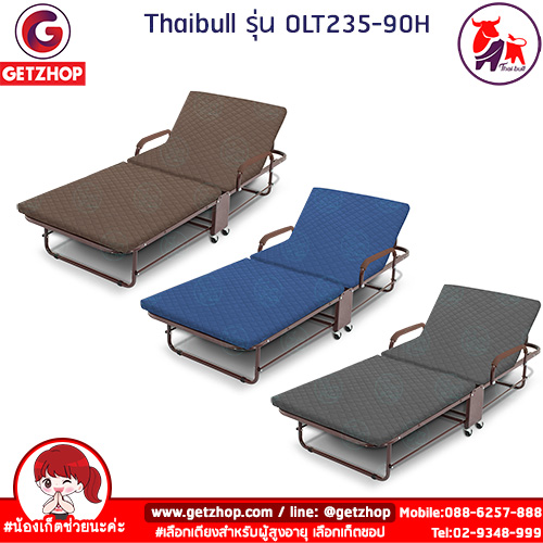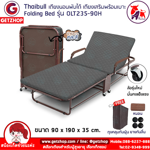 Thaibull เตียงนอนพับได้ 3 ฟุต เตียงเสริม เตียงพร้อมเบาะรองนอน เตียงปรับระดับได้ รุ่น OLT235-90H มีแขน (โครงน้ำตาล)