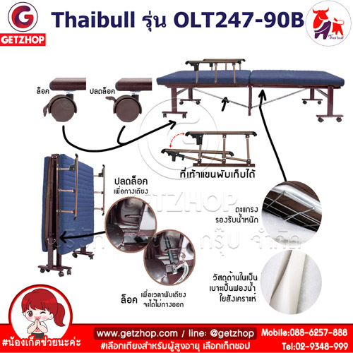 Thaibull เตียงพับ เตียงปรับระดับได้ เตียงผู้ป่วย เตียงเสริม เตียงนอนผู้ป่วย เตียงเหล็ก Fold bed Extra bed รุ่น OLT247-90B พิเศษ! (แขนพับได้)