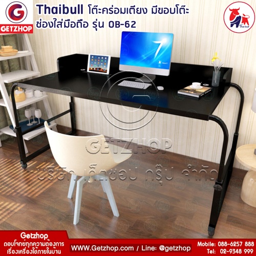 Thaibull รุ่น OB-62 โต๊ะทำงาน โต๊ะคร่อมเตียง โต๊ะอเนกประสงค์ มีขอบโต๊ะและช่องใส่มือถือ มีล้อ ขนาด 155 -240 สีดำ