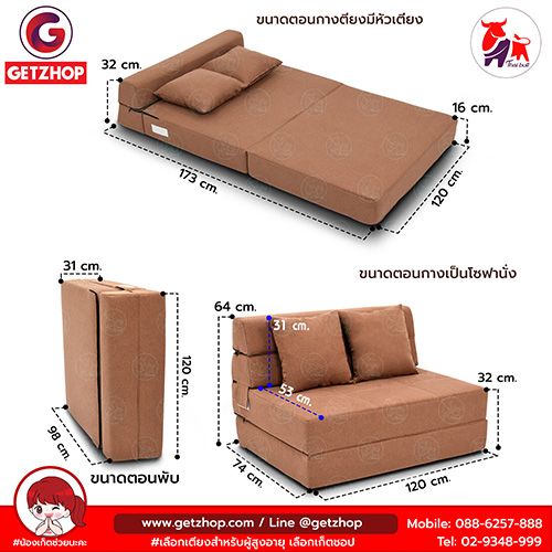 2.ขนาดตอนกางเป็นโซฟานั่ง : กว้าง x ยาว x สูง :(74x120x32 cm.)ความสูงจากพื้นถึงพนักพิง 64 cm./ความสูงจากเบาะนั่งถึงพนักพิง 31 cm./ความลึก 53 cm.